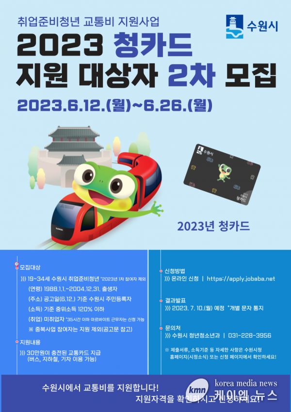 (케이엠뉴스) 수원시가 ‘2023년 취업준비청년 교통비 지원사업’ 지원 대상자 90여명을 6월 26일까지 모집한다.