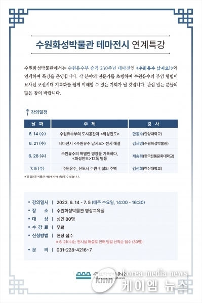 (케이엠뉴스) 수원화성박물관은 수원유수부 승격 230주년 기념 테마전 ‘수원유수 납시오’ 와 연계한 특강을 6월 14일부터 7월 5일까지 매주 수요일 진행한다.