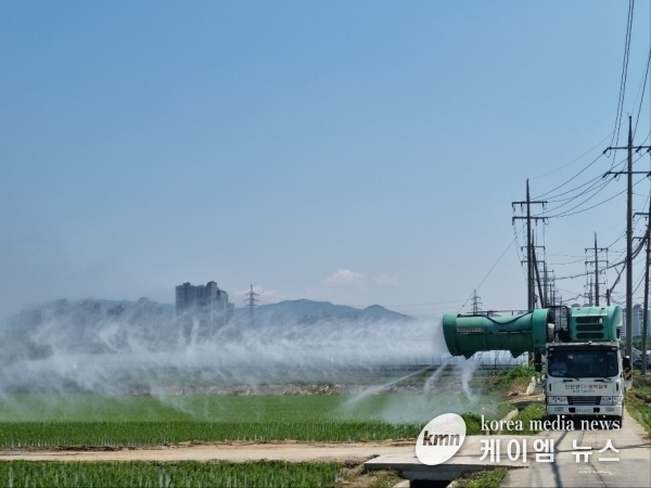 방제작업은 광역방제기를 탑재한 차량으로 농경지를 돌며 친환경 약제를 살포하는 방식으로 진행됐다.