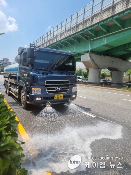 (케이엠뉴스) 수원시가 4개 구청·3개 민간 건설사와 협력해 도로 위 미세먼지와 폭염을 줄이는 고압 살수차를 운행한다.