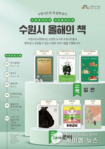 수원시 관계자는 “올해의 책을 선정해 수원시민이 함께 읽고 즐기는 프로그램을 준비 중”이라며 “책 읽는 문화가 확산할 수 있도록, 시민분들의 많은 관심과 참여를 부탁드린다”고 말했다.