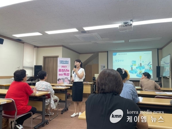 (케이엠뉴스) 수원시 팔달여성새로일하기센터와 수원시가족여성회관은 15일 가족여성회관 문화관에서 ‘2023 중장년 여성 사회재참여 맞춤특강’을 열었다.
