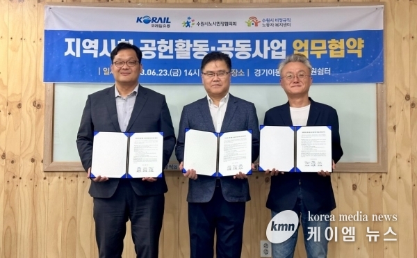 (케이엠뉴스) 수원시노사민정협의회, 코레일유통 경기본부, 수원시비정규직노동자복지센터는 23일 경기이동노동자 수원쉼터에서 ‘지역사회 공헌활동·공동사업 추진을 위한 업무협약’을 체결하고 협력을 약속했다.