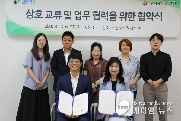 (케이엠뉴스) 사진1~2)수원시자원봉사센터는 27일 센터 3층 강당에서 ㈜클리어창과 사회적 공헌을 위한 상호 업무협약을 체결했다.