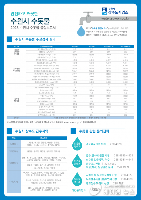 수원시상수도사업소가 수돗물 원·정수 수질 기준, 수질검사 결과, 수원시 상수도 시설 현황, 수돗물 생산·공급 과정, 맑은물 공급을 위한 노력, 안전한 수돗물 사용방법 등을 수록한 ‘2023 수원시 수돗물 품질보고서’를 제작해 시민들에게 공개했다.