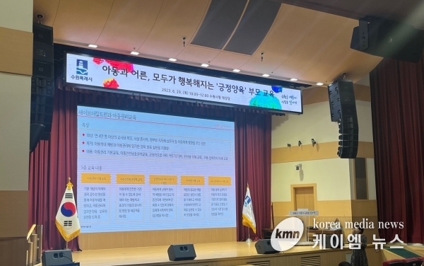 (케이엠뉴스) 수원시가 29일 시청 대강당에서 관내 민간 어린이집 영유아 부모 등을 대상으로 ‘긍정양육’ 교육을 했다.