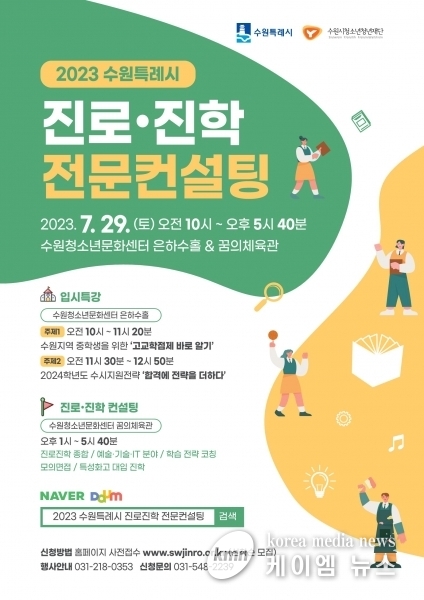 (케이엠뉴스) 수원시가 7월 29일 수원청소년문화센터에서 열리는 ‘2023년 진로·진학 전문컨설팅’에 참여할 학생을 21일까지 선착순으로 모집한다.