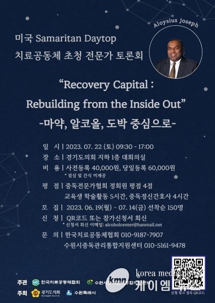 토론회는 세계적인 중독 치료공동체 기관인 미국 ‘사마리안 데이탑 빌리지’의 전문가 알로이시우스 조셉 디렉터의 강연으로 진행된다.