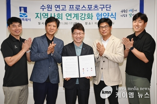 (케이엠뉴스) 수원시와 수원 연고 6개 프로스포츠 구단 홍보·마케팅 부서장이 실무협의체를 구성하고 사회공헌사업을 추진하는 등 지역사회 연계 강화를 위해 협력하기로 했다.