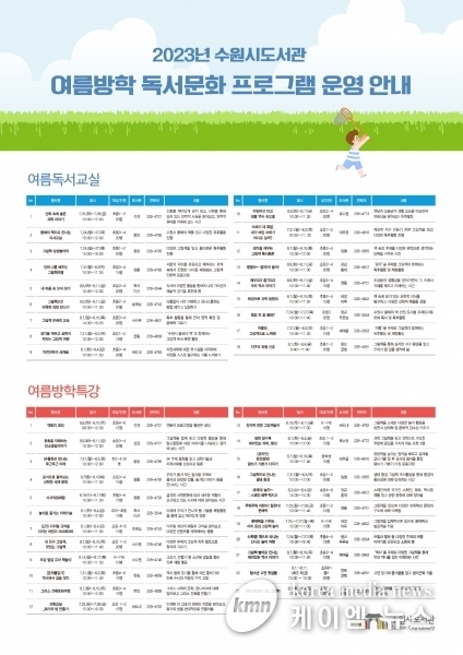 수원시 관계자는 “여름방학을 맞아 어린이·청소년들을 위해 풍성한 주제의 독서 프로그램을 마련했다”며 “많은 관심과 참여를 바란다”고 말했다.