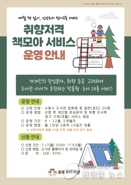 (케이엠뉴스) 수원시 호매실도서관은 시민 맞춤형 도서 대출 서비스인 ‘취향저격 책모아 서비스’ 참여자를 17일부터 31일까지 모집한다.