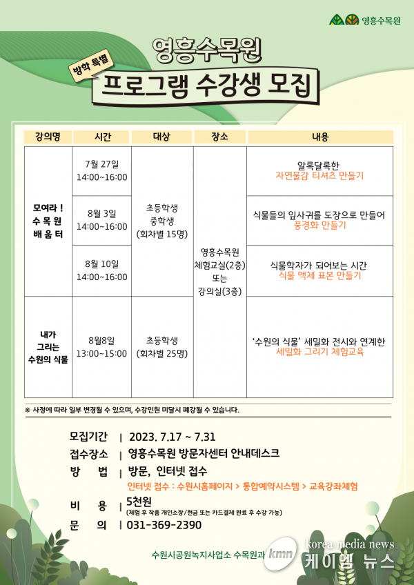 (케이엠뉴스) 수원수목원이 여름방학을 맞아 운영하는 특별 프로그램 ‘모여라 수목원 배움터’·‘내가 그리는 수원의 식물’에 참가할 초·중학생을 선착순으로 모집한다.