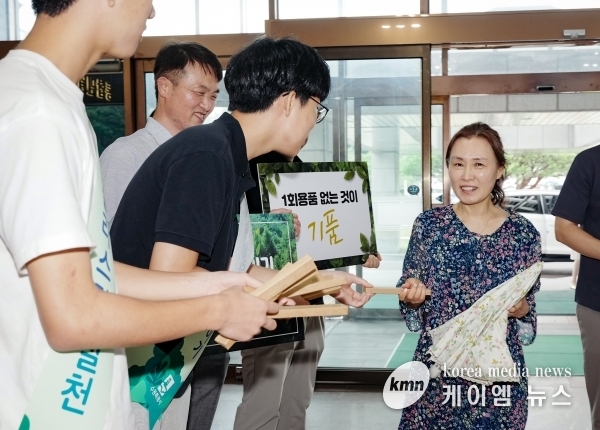 이들은 ‘플라스틱 사용자제’, ‘텀블러·장바구니 사용’ 등의 문구가 적힌 어깨띠를 두르고 시청을 방문하는 시민들에게 “플라스틱 사용을 자제해 달라”고 당부했다.