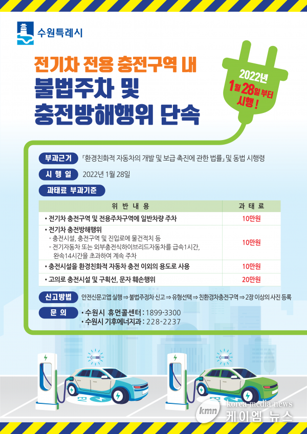 (케이엠뉴스) 수원시가 전기차 전용 충전 구역 내 불법주차와 충전방해행위에 대한 단속·홍보를 강화한다.