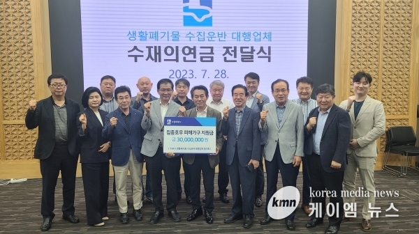 수원시 관계자는 “지난해에 이어 올해도 수재의연금을 기부해 주신 생활폐기물 수집·운반 대행업체협회에 감사드린다”며 “시름에 빠진 수재민들에게 큰 힘이 될 것”이라고 말했다.
