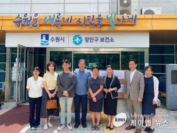 2일 장안구보건소 앞에서 진행된 전달식에는 김지훈 수원시의사회장, 안윤표 수원시치과의사회장, 정진용 수원시한의사회장, 신지연 수원시약사회 사회참여담당 부회장, 권명희 장안구보건소장, 김미선 행복캄 총괄이사 등이 참석했다.