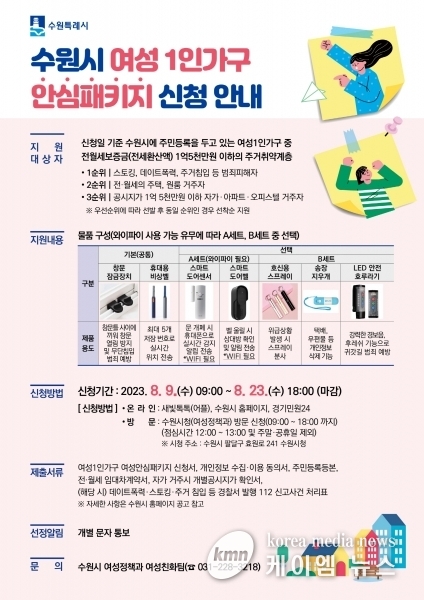 수원시는 8월 9일부터 23일까지 ‘수원시 여성1인가구 여성안심 패키지 지원사업’에 참여할 240여 가구를 모집한다.