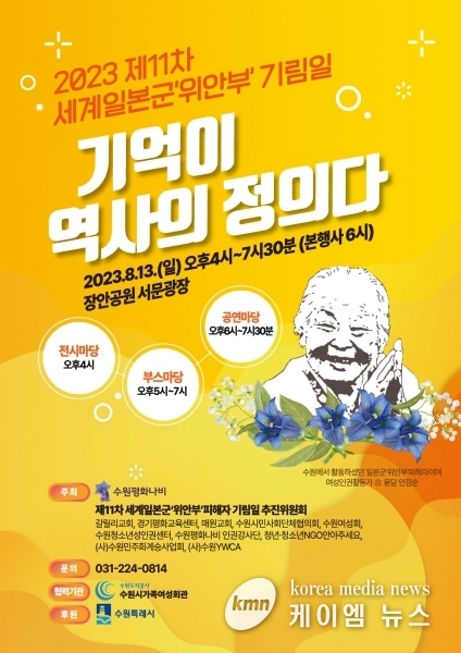 (케이엠뉴스) 8월 13일 오후 4시 수원 장안공원 서문광장에서 ‘제11차 세계일본군 ‘위안부’ 피해자 기림일’ 행사 ‘기억이 역사의 정의다’가 열린다.