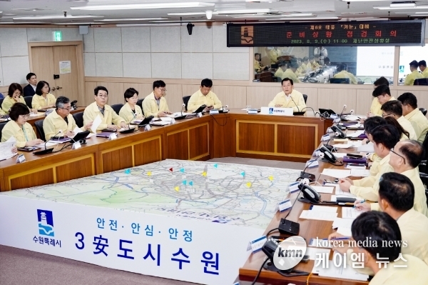 (케이엠뉴스) 수원시는 9일 시청 재난안전상황실에서 긴급대책회의를 열고 제6호 태풍 ‘카눈’으로 인한 피해를 최소화할 방안을 논의했다.