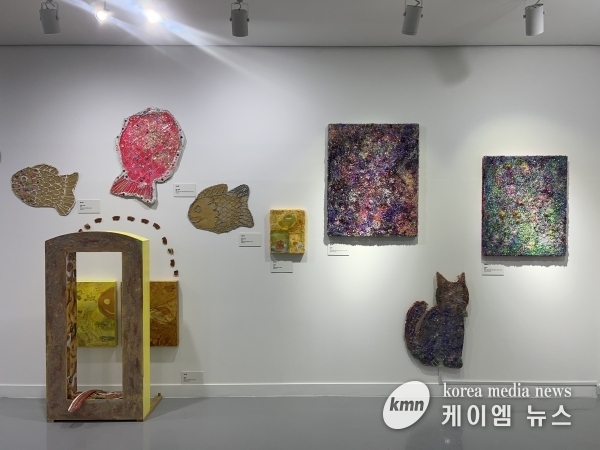 감자칩 이미지를 콜라주와 여러 물체를 한데 모아 미술 작품을 제작하는 기법인 아상블라주 방식으로 표현한 ‘감자칩 월드컵’과 국내 문구점에서 쉽게 구할 수 있는 재료들을 설치 작품 형태로 제작한 신작 ‘브라우니’, ‘트리 하우스’ 등을 선보인다.