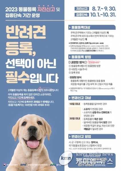 (케이엠뉴스) 수원시가 동물의 보호와 유실·유기를 방지하고 동물등록률을 높이기 위해 9월 30일까지 ‘동물등록 자진신고 기간’을 운영한다.