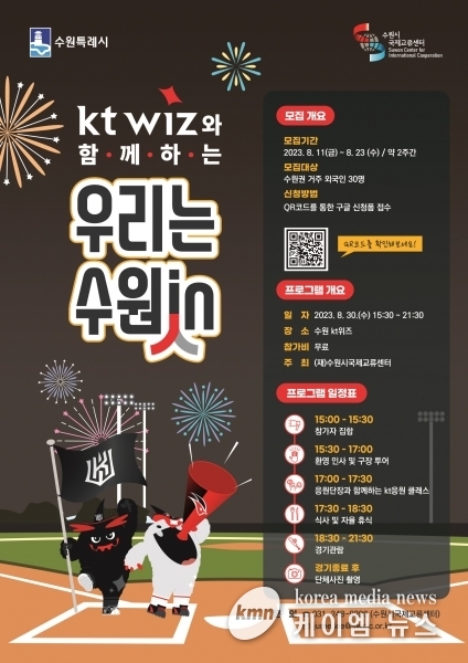 (케이엠뉴스) 수원시국제교류센터가 수원시 외국인 지역이해 프로그램인 ‘kt 위즈와 함께하는 우리는 수원in’에 참가할 외국인 30명을 8월 23일까지 모집한다.
