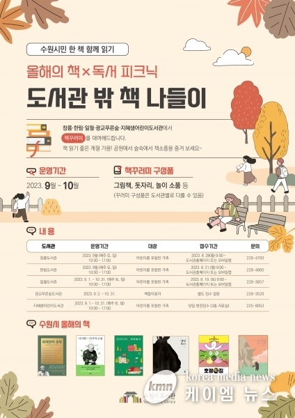 (케이엠뉴스) 수원시가 ‘수원시민 한 책 함께 읽기’ 프로그램인 ‘올해의 책×독서 피크닉, 도서관 밖 책 나들이’를 운영한다.