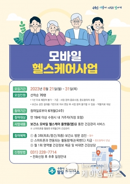 (케이엠뉴스) 수원시 팔달구보건소가 모바일 헬스케어 사업에 참가할 만 19세 이상 수원시민 70명을 모집한다.