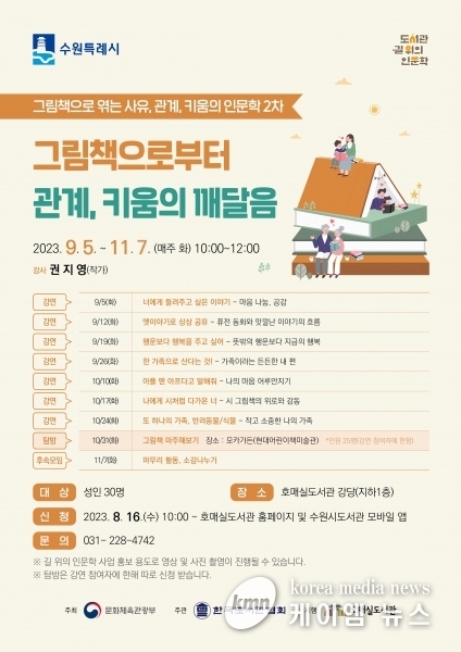 (케이엠뉴스) 수원시 호매실도서관이 2023년 길 위의 인문학 ‘그림책으로부터 관계, 키움의 깨달음’ 강좌에 참여할 시민 30명을 모집한다.