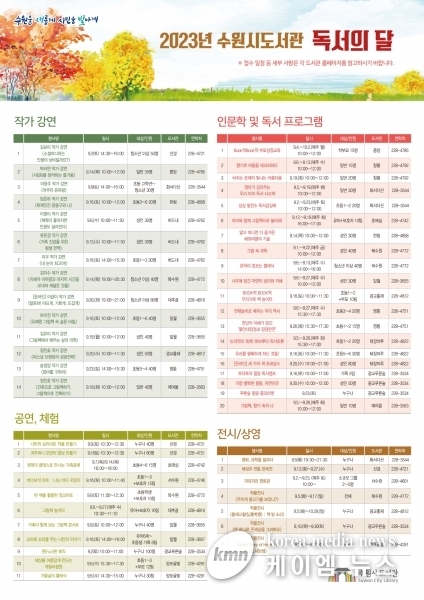 수원시도서관사업소 관계자는 “독서의 달을 맞아 변화하는 독서환경에 발맞춰 풍성하고 다양하게 프로그램을 기획했다”며 “많은 시민이 독서문화프로그램에 참여하길 바란다”고 말했다.