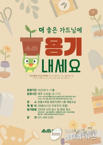 (케이엠뉴스) 수원시가 영흥수목원에서 ‘업사이클링 가드닝’ 교육 프로그램 ‘더 좋은 가드닝에 ‘용기’ 내세요’를 운영한다.