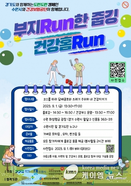 수원시보건소와 경기도, 국민건강보험공단 인천경기지역본부가 공동 주최하는 ‘부지RUN한 줍깅 건강홈RUN’은 9월 1일 오후 1시 30분부터 5시까지 열린다.