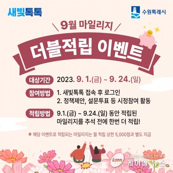 (케이엠뉴스) 수원시가 9월 1일부터 24일까지 모바일 시정참여 플랫폼 ‘새빛톡톡’에서 활동하는 시민들에게 적립 마일리지를 두 배로 주는 이벤트를 진행한다.