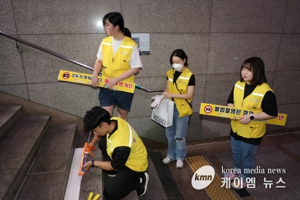수원시자원봉사센터와 ‘청년팀플 수원청년봉사단’은 27일 오후 수원역 6번 출구 계단에 ‘불법 촬영은 잠깐, 징역은 7년’, ‘모두가 지켜봅니다, 불법 촬영 NO’ 등 표찰을 부착했다.