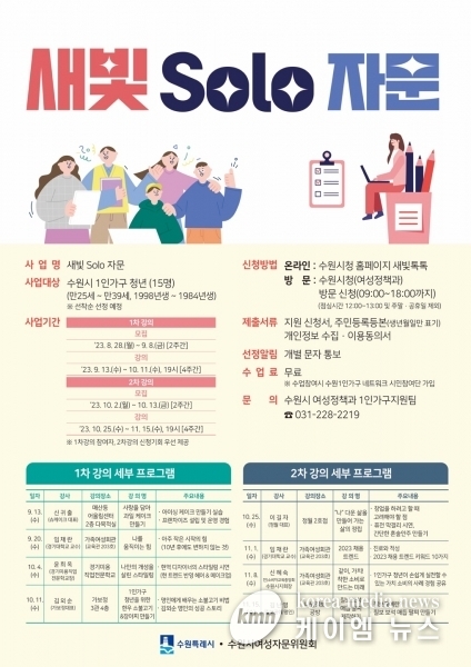 (케이엠뉴스) 수원시가 1인 가구 맞춤 강의 ‘새빛 솔로 자문’에 참여할 수강생을 9월 8일까지 모집한다.