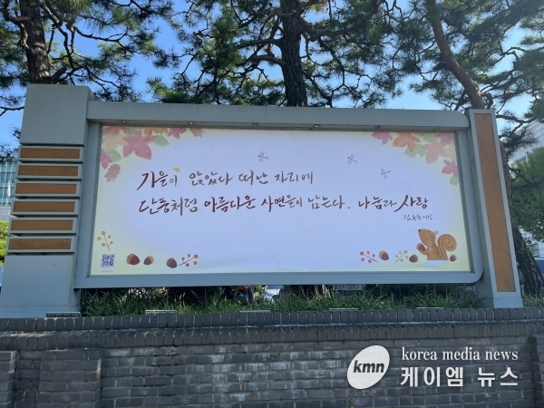 (케이엠뉴스) 수원시가 2023년 수원희망글판 가을편 문안 ‘가을이 앉았다 떠난 자리에단풍처럼 아름다운 사연들이 남는다.