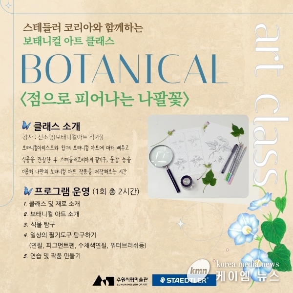 (케이엠뉴스) 경기도 수원시 수원시립미술관은 독일 문구 기업 스테들러코리아와 함께 SUMA 뮤지엄데이 ‘보태니컬 아트 클래스 : 점으로 피어나는 나팔꽃’을 9월 23일 수원시립미술관에서 개최하며 9월 5일부터 참여자를 모집한다.