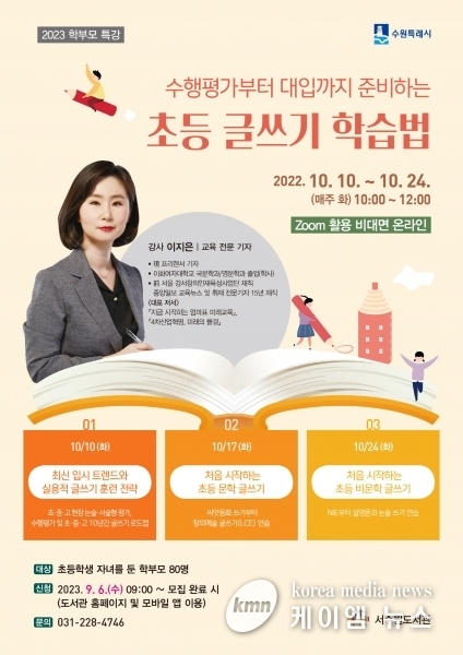 서수원도서관 관계자는 “가정에서 초등학생 자녀에게 글쓰기를 지도하는 데 도움을 주고자 특강을 마련했다”며 “많은 학부모가 참여해 주시길 바란다”고 말했다.