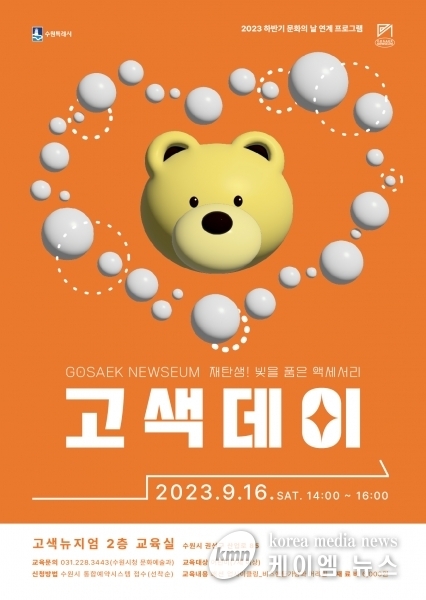 (케이엠뉴스) 수원시가 버려진 천을 새활용해 비즈 핸들 가방과 머리핀을 만드는 체험 프로그램인 ‘고색데이’에 참여할 7세 이상 어린이 20명을 선착순으로 모집한다.