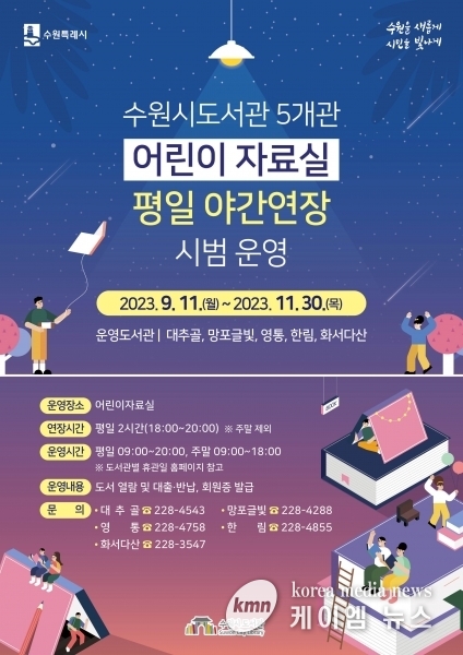 (케이엠뉴스) 도서 대출이 많은 수원시도서관 5개 관이 11월 30일까지 어린이자료실을 연장 운영한다.