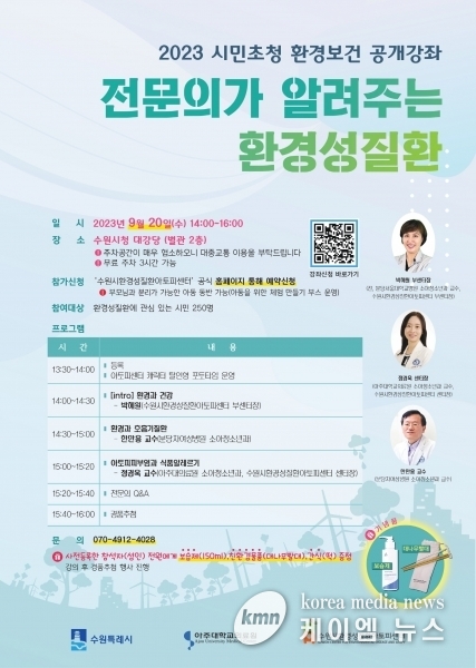 (케이엠뉴스) 수원시 환경성질환아토피센터는 9월 20일 수원시청 대강당에서 시민초청 환경보건 공개강좌 ‘전문의가 알려주는 환경성질환’을 연다.