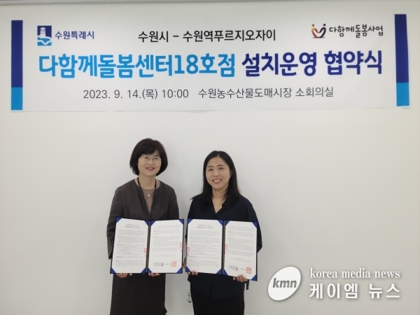 수원시와 수원역푸르지오자이 입주자대표회의는 14일 수원농수산물도매시장 소회의실에서 수원시 다함께돌봄센터 18호점 설치·운영을 위한 협약을 체결하고 협력을 약속했다.