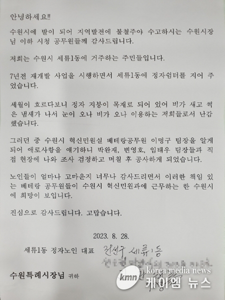 어르신들은 이재준 시장에게 보낸 편지에서 “정자 지붕에서 비가 새고 썩은 냄새가 나 눈이 오나 비가 오나 정자를 이용하는 저희로서는 난감했다”며 “그러던 중 새빛민원실 베테랑 공무원을 알게 돼 애로사항을 얘기하니, 현장에 나와 조사를 하고 며칠 후 공사가 시작되게 해주셨다”고 말했다.