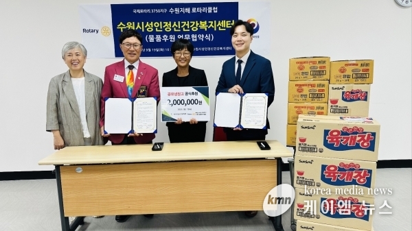 국제로타리 3750지구 수원지해로타리클럽은 개소식에 앞서 수원시와 협약을 체결하고 내년 6월까지 공유냉장고를 채울 음식물을 후원하기로 했다.