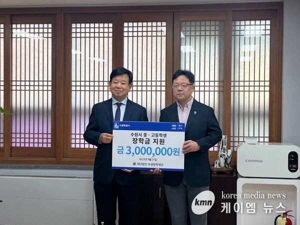 (케이엠뉴스) 아주대학교 공익 재단법인 아경장학재단이 21일 “수원시 취약계층 중·고등학생 장학금으로 사용해달라”며 장학금 300만원을 수원시에 전달했다.