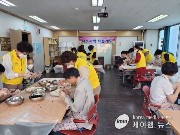 수원시 나눔사랑민들레봉사단 회원 등 20여명은 에이블 장애인직장 적응 훈련센터 훈련생들과 함께 송편, 강정을 만들어 먹었다.