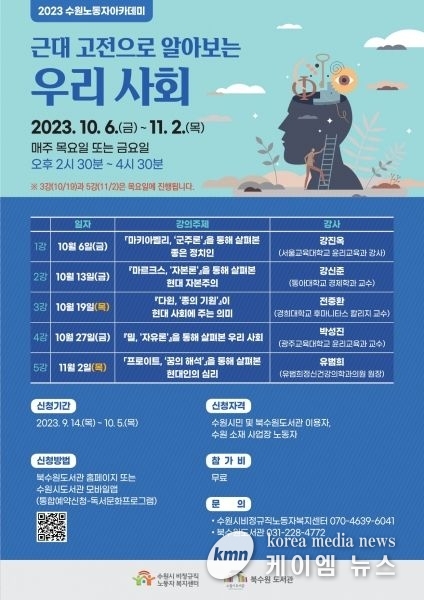 (케이엠뉴스) 수원시비정규직노동자복지센터가 2023 하반기 수원노동자아카데미 ‘근대 고전으로 알아보는 우리 사회’를 운영한다.