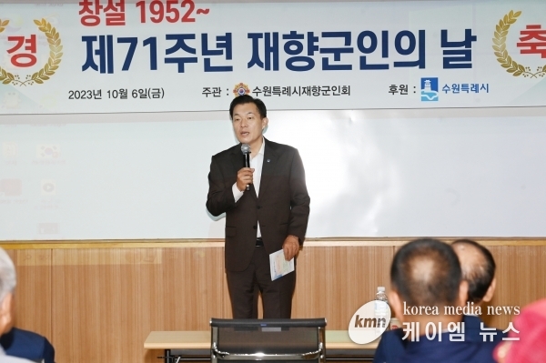 (케이엠뉴스) 이재준 수원특례시장이 6일 수원시보훈연구원에서 열린 ‘제71주년 재향군인의 날 행사’에서 “지역사회에서 많은 봉사활동을 해주시는 재향군인회에 감사드린다”고 말했다.
