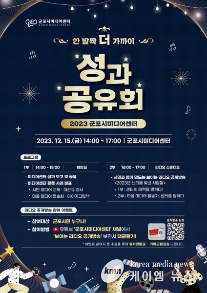 (케이엠뉴스) 군포시미디어센터는 오는 15일 오후 2시 2023년 사업성과를 공유하고 2024년 미디어센터의 운영 방안을 모색하기 위한 자리를 마련한다.