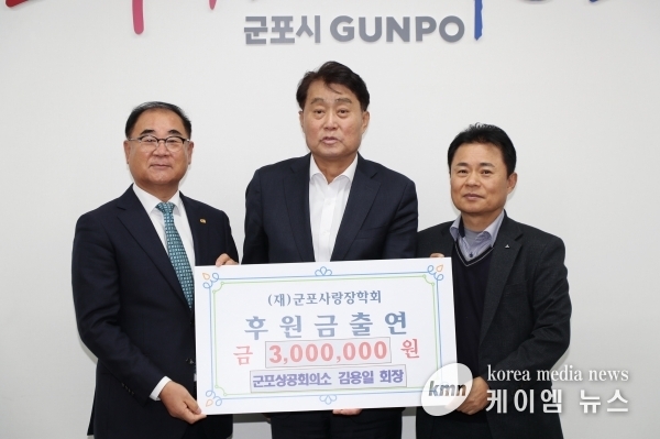 (케이엠뉴스) 군포상공회의소 김용일 회장이 1월 4일 시장실에서 )군포사랑장학회에 장학금 300만원을 후원하는 출연식을 가졌다.